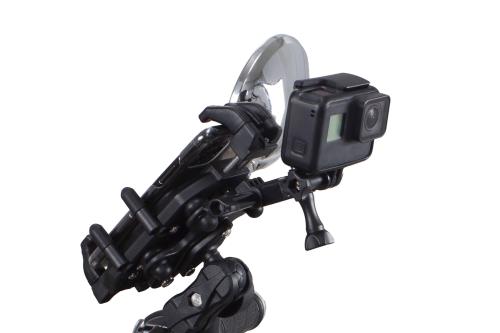 モバイルホルダーの背面にはAirクッションを採用することで、エンジン振動や路面からのギャップを低減することが可能になり、スマートフォンの破損リスクを低減することが可能。ホルダーにはアクションカメラ用のブラケットを装着できる様にしており、拡張性に優れています。クランプ部はボールジョイントを採用し3D角度調整可能で自由度があります。本製品は盗難防止構造を採用しており、専用工具でクランプ部を固定することで簡単に外すことができない仕様になっています。SP武川ロゴ入り。
