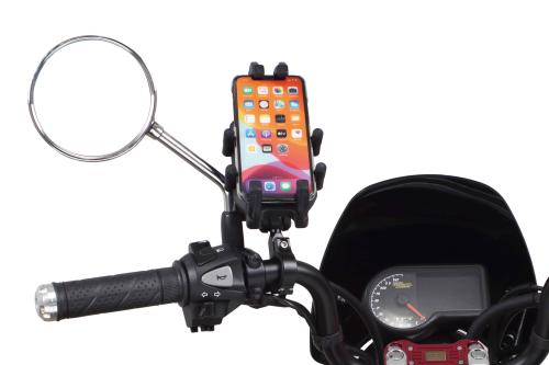 パイプ径Φ22/25.4mmに取り付け可能なスマホホルダーです。縦幅125mm~197mm、横幅65mm~94mm、厚み17mm、上下左右と幅広く調整式のホルダーを採用。