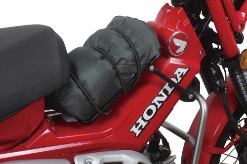 ハンドルとシートの間にあるスペースに本製品を装着することで、レインウェアやバックを付属のゴムロープにより固定することができます。
