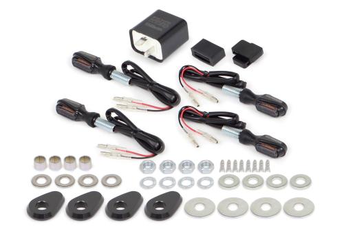 車両専用キットは、ストリームラインミニLEDウインカー(4個)にワイドレンジフラッシャーリレー(1個)、ブラケット(4個)、プレーンワッシャー(厚み2.6mm×2個)、プレーンワッシャー(厚み3mm×2個)、スペーサー(4個)、オスギボシ(8個)が付属しています。