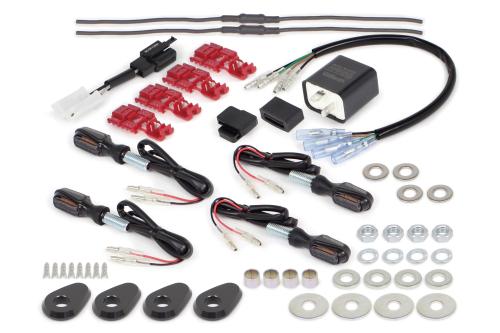 車両専用キットは、ストリームラインミニLEDウインカー(4個)にワイドレンジフラッシャーリレー(1個)、リレーコード(1個)、ハーネスCOMP.(1個)、ブラケット(4個)、スペーサー(4個)、プレーンワッシャー(厚み2.6mm×4個)、オスギボシ(8個)が付属しています。