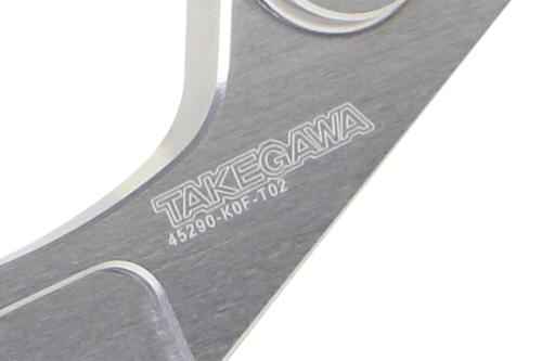 キャリパーブラケットは超々ジュラルミン材を削り出し十分な強度を持たせております。表面には、耐食性に優れたアルマイト処理を行っております。SP武川ロゴ入り。