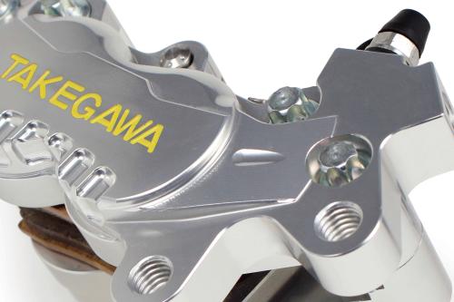 優れた制動力を発揮し、アルミ削り出しカラーアルマイトにより、デザイン性を高めた“アルミビレット4POTキャリパー”