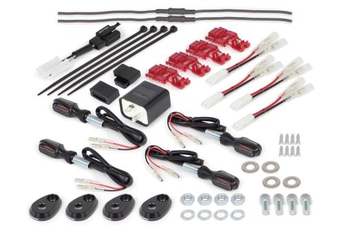 車両専用キットは、ストリームラインミニLEDウインカー(4個)にワイドレンジフラッシャーリレー(1個)、リレーコード(1個)、ブラケット(4個)、ウインカーサブハー