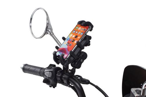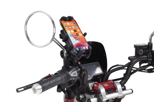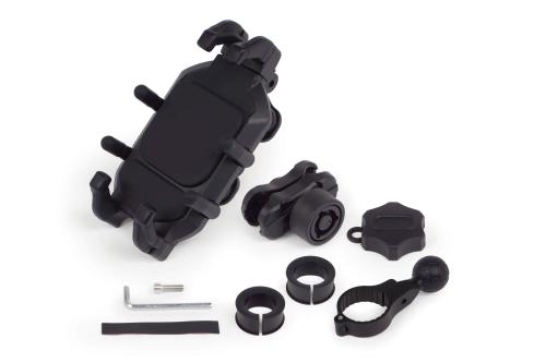パイプ径Φ22/25.4mmに取り付け可能なスマホホルダーです。縦幅125mm~197mm、横幅65mm~94mm、厚み17mm、上下左右と幅広く調整式のホルダーを採用。