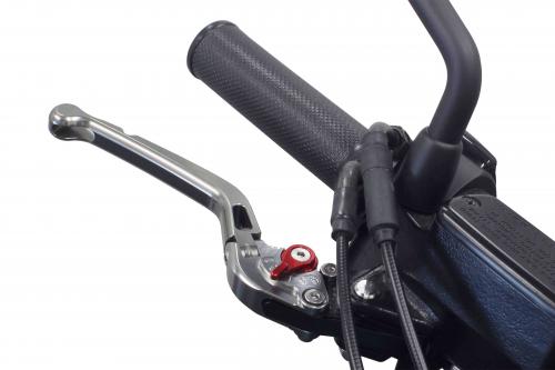 転倒の際、レバーを折損しにくくする為、レバー部分が折れ曲がる可倒式のレバーです。レバーには手のひらのサイズに合わせ、レバーの位置が調整出来るアジャストレバーが装備され、6段階の範囲で調整することが出来ます。レバー本体はアルミ材を削り出し、カラーアルマイトが施されています。