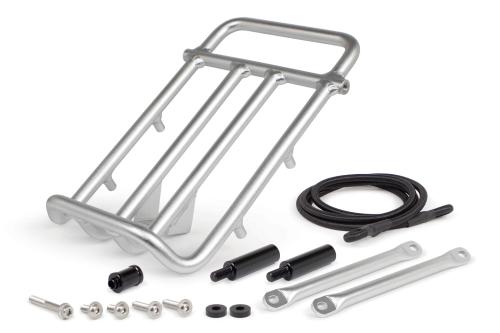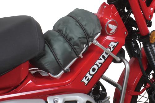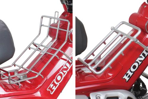 乗車時、シフトチェンジ、リアブレーキ時に影響を及ぼさない範囲で、キャリア面積を大きく確保しています。 又、荷物の脱落を防止する為、下部に荷物止めとなる折り返し、ゴムネットやゴムバンド等を引っ掛ける左右の突起を採用するなど、実用性を重視した設計になっています。 ■センターキャリアキットには、荷物固定用“ゴムロープ”が付属 ■キャリア中央にSP武川ロゴ入り