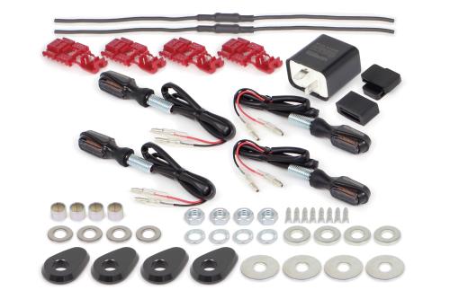車両専用キットは、ストリームラインミニLEDウインカー(4個)にワイドレンジフラッシャーリレー(1個)、ブラケット(4個)、プレーンワッシャー(厚み2.6mm×2個)、プレーンワッシャー(厚み3mm×2個)、スペーサー(4個)、オスギボシ(8個)が付属しています。