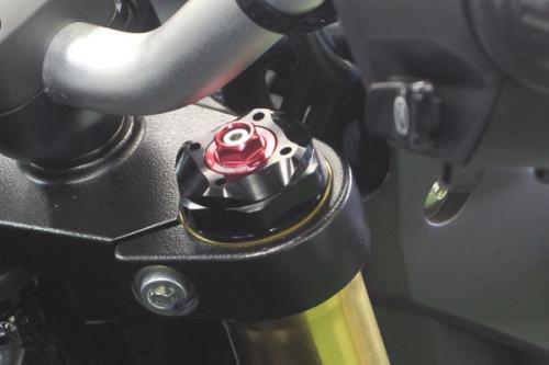 イニシャルアジャスターをモチーフにアルミを精巧に削り出し、表面にアルマイトを施したフロントフォークトップボルトです。