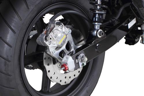 キャリパーブラケットは超々ジュラルミン材を削り出し十分な強度を持たせております。表面には、耐食性に優れたアルマイト処理を行っております。SP武川ロゴ入り。