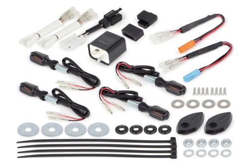 車両専用キットは、ストリームラインミニLEDウインカー(4個)にワイドレンジフラッシャーリレー(1個)、リレーコード(1個)、ウインカーポジションハーネスR(1個)、
