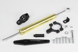 減衰力特性とフリクションロス低減によりスムーズな作動を実現し、高負荷時には適切なダンピングが得られます。 ストローク量:125mm 減衰力調整はボディー一体型ダイヤル式で9段階調整を採用。 ステアリングダンパーのシェルボディーはアルミ材を精巧に削り出し、表面にシャンパンゴールドアルマイトを施しています。 付属のピロボール付きダンパーホルダーはアルミ削り出しシルバーアルマイトを採用。 ボディー、ホルダー共に弊社ロゴのレーザーマーキング入り