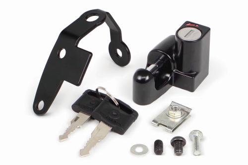 付属のヘルメットホルダーステーの内1カ所はハンドルカウル内にあるハンドルバーに固定されているミラーステー部分に付属のクリップナットを使用し、ステー を固定します。それにより、ハンドルカウル内にボルトがある為、安易にヘルメットロックを外す事ができない構造になっております。 更に2ヶ所固定のもう1カ所はミラーアダプターにより、ミラーと共締めでしっかりと固定されます。 SP武川オリジナルピストンキー(2個)付属。 ステー本体はスチール製ブラック塗装仕上げ。